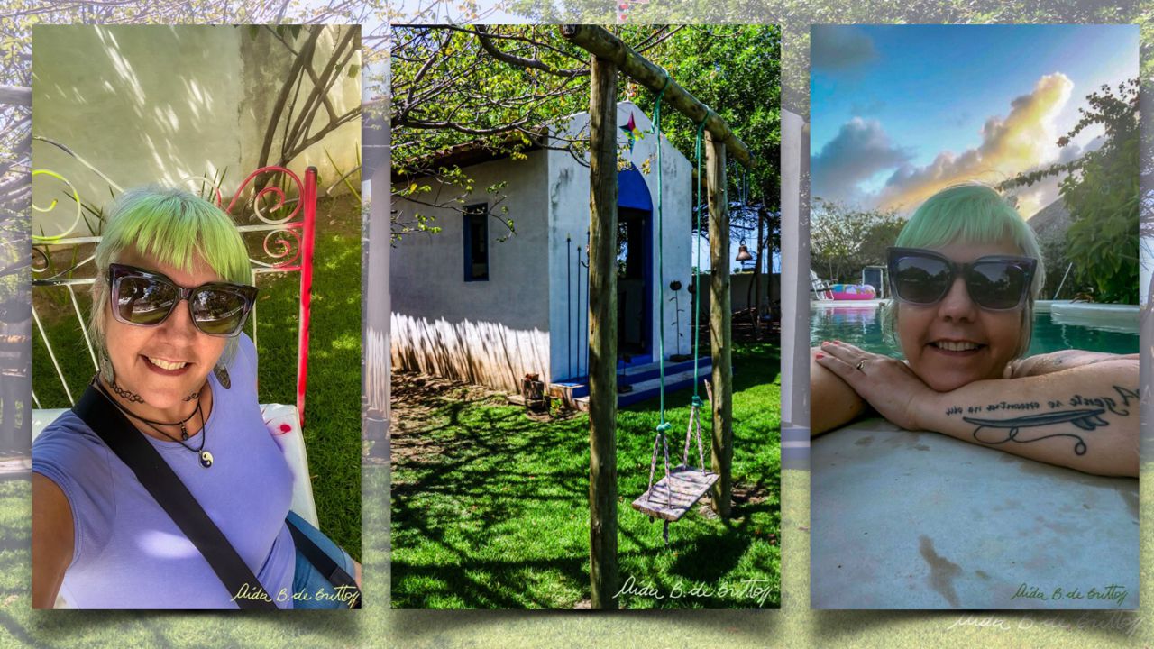 Nesse ínterim finalmente ele construiu a escada e me mandou uma foto, que eu fiz um desenho, pois para mim aquela escada era um caminho mais seguro para a paz do meu coração… ai veio pandemia, diagnóstico… ombro deslocado, braço fraturado, eu lidando com efeito colateral de radioterapia e o pior sentindo as mudanças hormonais causadas pela medicação que tomo até hoje, mas que na época eu me sentia numa nuvem, como se tudo que estivesse acontecendo fosse um sonho, mas muitas vezes eram pesadelos… eu estava fragilizada e eram poucas as pessoas que eu confiava. Foi realmente um puerpério ‘punk’ pois os efeitos da radioterapia também estavam muito fortes. E foi nessa vibe que em 2022 eu fui parar no meu ‘refúgio’, me sentia uma estranha para todos, depois do que passei as coisas e as pessoas não eram mais a mesma!
