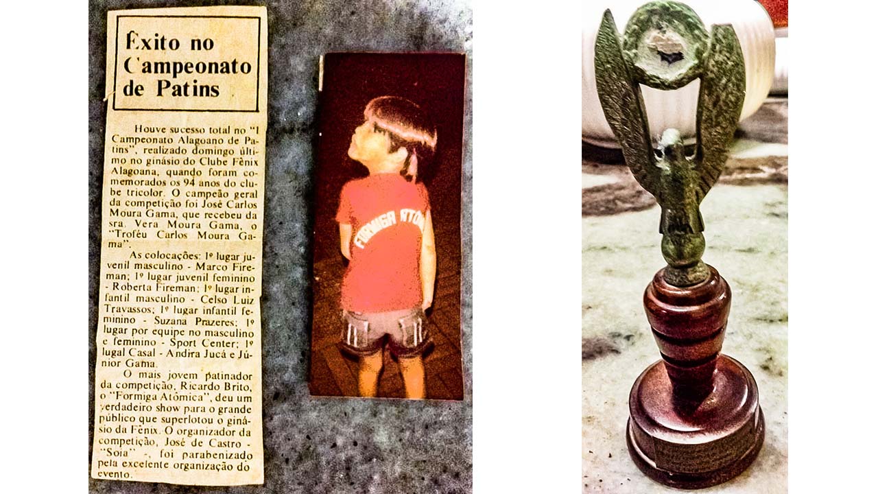 Descobri no seu guarda vestidos, colado na porta, no meio de diversas fotos dos filhos, netas e amigas falecidas, uma nota e uma foto sobre o 1. Campeonato Alagoano de Patins realizado no Clube Fênix Alagoano. Dentre notícias sobre a classificação dos patinadores, ao final lê – se “0 mais jovem patinador da competição, Ricardo Britto, o “Formiga Atômica” deu um verdadeiro show para o grande público que superlotou o Ginásio da Fênix”. A minha Maria no seu jeito de ser, meigo, calada e sem alardes vibrou com o feito do seu filho caçula, com apenas 5 anos já era um vitorioso.