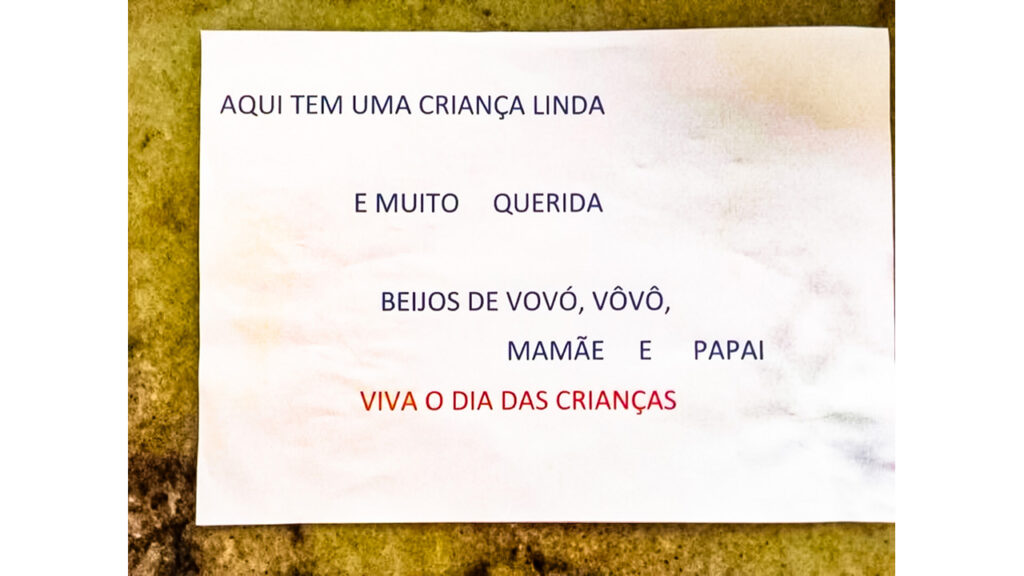 Maria me pediu que imprimisse um cartaz para acompanhar o presente e no dia das crianças ela ao chegar para o almoço, eu segurei o cartaz e Maria atrás de mim com o boneco gigante como a Gabi queria. Foi uma alegria muito grande. Gabi imediatamente batizou de Guilhermina.